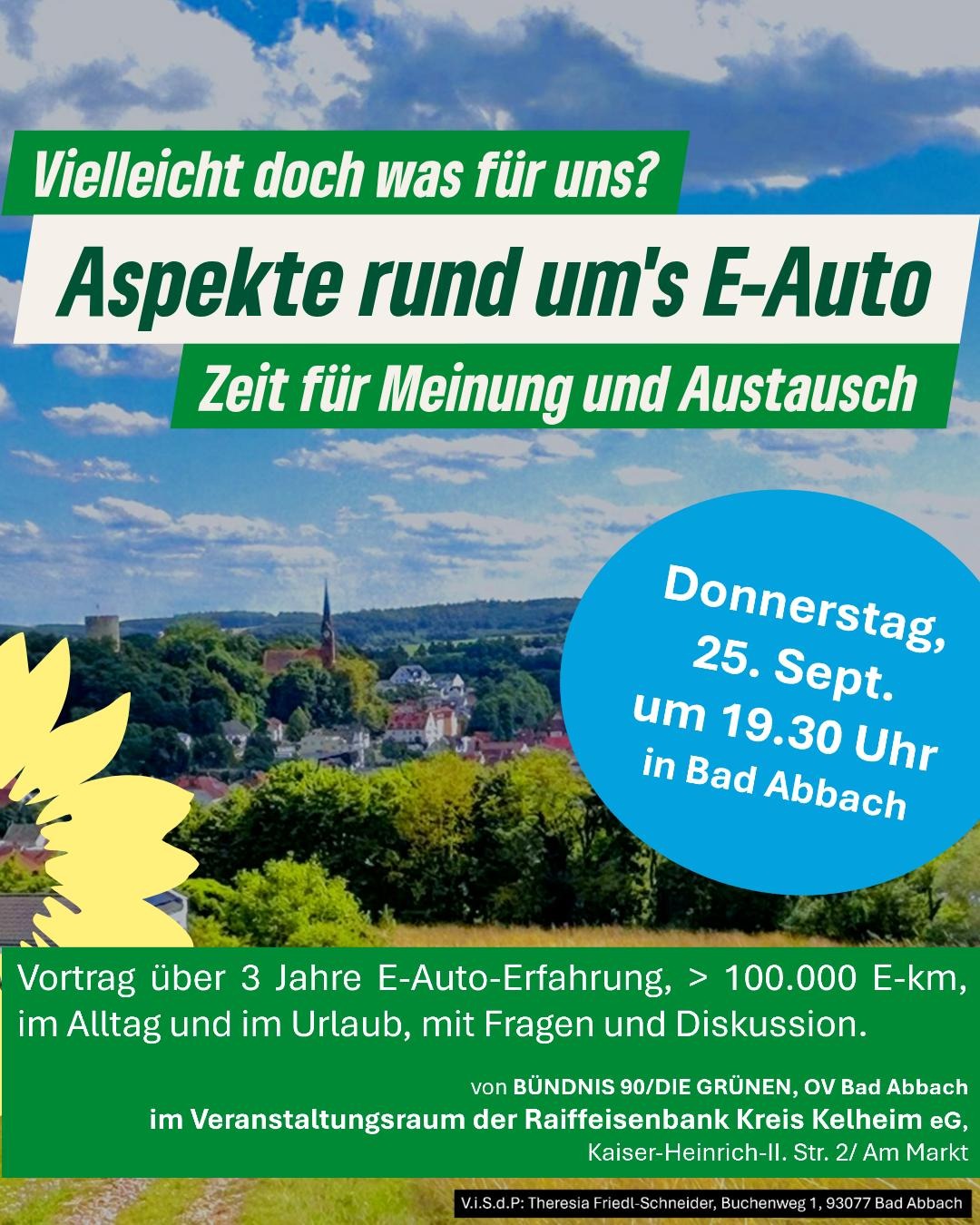 Aspekte rund um’s E-Auto Vortrag über 3 Jahre E-Auto-Erfahrung, > 100.000.E-Km, im Alltag und im Urlaub, mit Fragen und Diskussionen. Donnerstag25.09.202519:30 UhrVeranstalltungsraum der Raiffeisenbank Kreis Kelheim eGKaiser-Heinrich-II. Str. 293077 Bad Abbachorganisiert von Bündnis 90/Die Grünen, OV Bad AbbachDownload als ics-Datei
